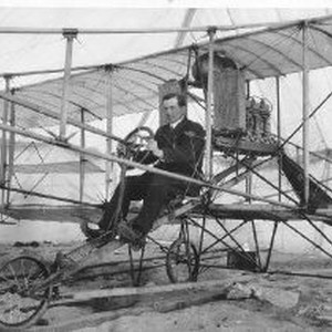 Unidentified man operating a bi-wing nose-gear airplane. The engine is above and in the rear of the aircraft.