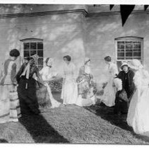 Eight girls in Victorian dresses and bonnets posed on lawn outside building.