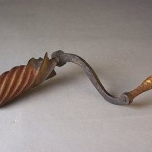A sauage grinder and stuffer of cast iron with turned wood handle. See also #288-289 for other parts (?).