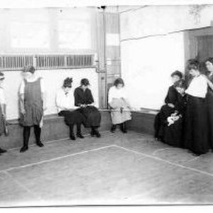 Gymnasium scene with four women and five girls. Two of the girls are carrying "indian clubs" used in juggling acts.