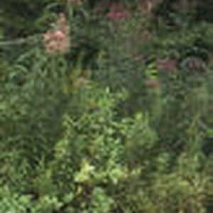 Pink flowers and green shrubs on roadside at visitors center in Gatlinburg, Tennessee.