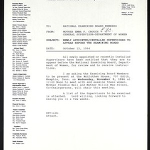 Emma F. Crouch (Church of God in Christ), Dallas, Texas, letter, 1994 October 12, to National Examining Board members (Church of God in Christ). Enclosure: List of 1994 Church of God in Christ Department of Women supervisors to appear before Examining board. [Description English/roman)]