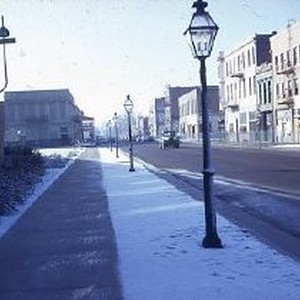 Old Sacramento historic district street scene on Second Street between I and J Streets showing snow on the ground