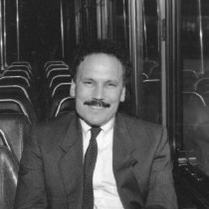Smiling man with curly hair seated on bus wearing suit and tie.