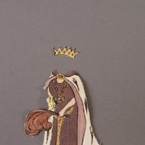 A paper doll cut from a paper doll book. A girl with an assortment of clothes and accessories. Gown and crown.