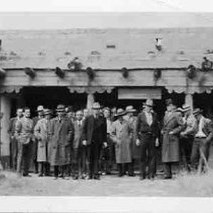 Photograph of Aubrey Neasham and group in front of unidentified building, 1940.