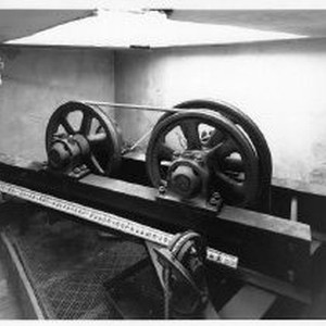 Interior view of the Merrium Apartments before demolition showing the elevator mechanism