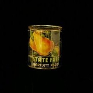 Can, metal with paper label printed with image of pears. Label reads in part "STATE FAIR BARTLETT PEARS / PACKED IN THE GOLDEN EMPIRE BERCUT RICHARDS PACKING COMPANY."