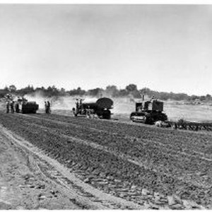 Men and heavy equipment prepare earth at Folsom Dam construction site.