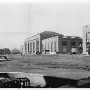 View looking west at the new Southern Pacific Railroad depot nearly completed. The I Street railroad bridge is in the center background.