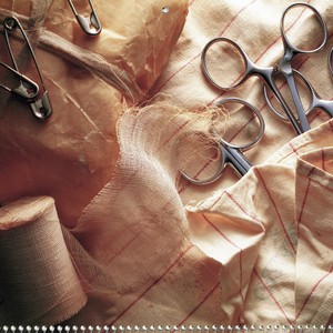 Scope/Content: February image titled Ambulance Kit from a 1988 calendar titled Advances in Healthcare; items pictured are from the University of California, San Francisco Archives, Health Sciences Artifact Collection; calendar copyright 1987 Harwood Co.; 1930s sutures and gauze, safety pins.