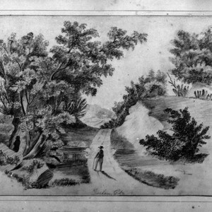 Hand-drawn scene of a person walking on a path in wooded hills. MS note on folder reads "Country scene of Durham, Ct. 1 Photograph (4 copies). Photographed from the original in possession of Elizabeth Vincent (Huntington) Metcalf, Apr. 16, 1930." Currently only 3 copies in folder. Elizabeth Metcalf was one of Henry's three daughters. MS note on verso of each copy gives picture size - 7.5 in x 10.5 in - and frame size - 12.125 in x 14.5 in."