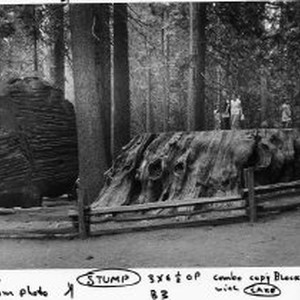 View of the Calaveras Big Trees State Park in Toulumne County. In this view the stump is from a 302 foot-tall giant sequoia that was felled in 1853. The circumference is 96 feet.