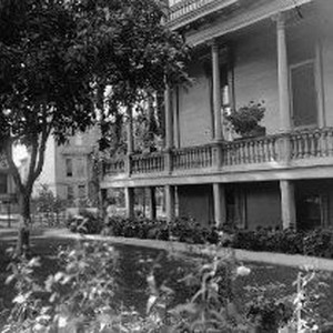 View of the side and porch of the Sacramento women's home. Porch extends around entire building. Yard is fenced.
