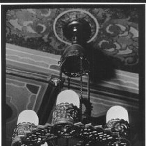 View of chandelier and light fixtures as well as artwork on ceiling within the Alhambra Theatre.