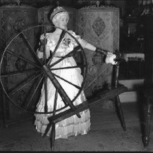 Woman wearing Days of '49 costume stands behind a spinning wheel.