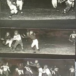 Photo--Black and white: Analy High School football game vs Tamalpais, Friday, October 28, 1949 at Tamalpais. Three photos of game in play. Tamalpais 28--Analy 25.
