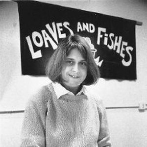 Joan Matonis, volunteer coordinator and nurse for Loaves and Fishes, greets guests in the dining hall.