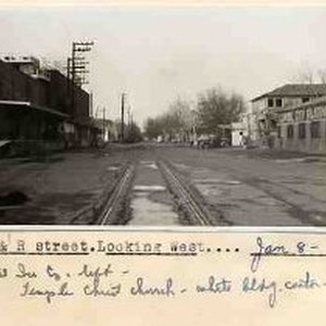 Typed and handwritten on binder page "17th & R street. Looking West...Jan 8- 1950. Crystal Ice Co., left - Temple Christ Church - white bldg - center- right " ./ Capital City Plating on the left.