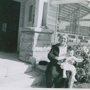 Infant Martha O. Hetzler sits on her grandmother Luz's knee on the front stoop of the family home in Boyle Heights. The sign in the window reads 'Harry R. Otsubo, Notary Public, Real Estate Broker' was left when the Japanese American owners were interned.