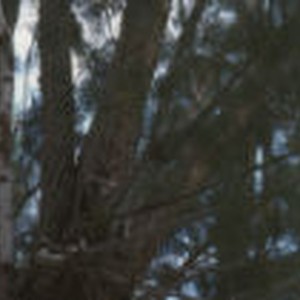 Owl perched in tree.