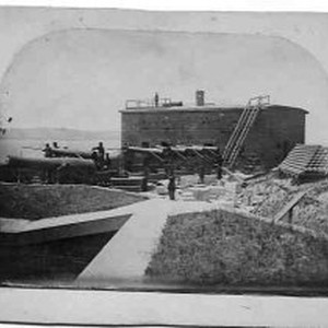 The left flank of South Battery and its caponier. A shortage of acceptable brick caused the engineers to build this battery from blocks of Angel Island sandstone. Atop the caponier sits a sentry box with a crenelated roof. San Francisco Bay can be seen in the background.