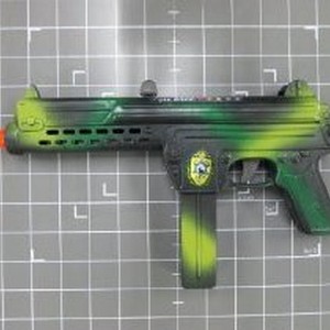 Plastic toy green/black automatic pistol, "FOCE" sticker on one side. "No. 2002"