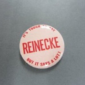 Red text on pink background. "It's Tough to Say Reinecke but it says a lot!" Edwin Reinecke served in the House of Rep. and ran for CA Governor in 1974.