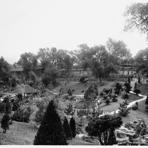 Looking east across garden canyon to wisteria pergola on east ridge of garden. The label that accompanies this photo in the album reads "No. 76 Center section, Japanese garden, about 1915."
