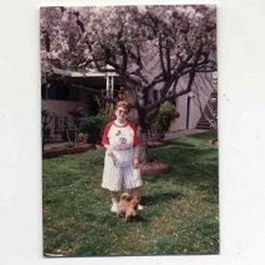 Photograph of Betty Blotter with her dog in the yard in front of her apartment on a spring day.