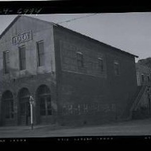 I. O. O. F. International Order of Odd Fellows hall in unidentified town, probably one of the mining towns in Sierra foothills