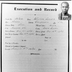 A photo of the record of execution of Walter Lewis who was hanged on August 3, 1934, following a conviction for first degree murder. This record, found in the Folsom Prison Death Book, contain remarks that the underlying murder was of a crippled girl with an ax.