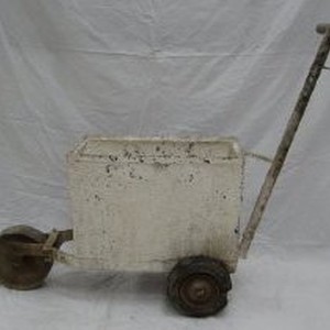 Portable chalking device with three wheels and double handle. Basin was likely filled with chalk from which the separate line-chalker and other chalking devices (2010/007/020-022) could replenish their chalk supply. Chalking basin is caked with layers of dried chalk. Front wheel is metal; back two are of rubber surrounding a metal spoke.