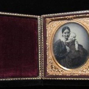 Cased ambrotype of a woman and infant. Identified by family members as Mary Lemyra Sims and her daughter Mary Elizabeth "Lizzie" Sims. Includes folded note on paper(c) and lock of hair (b).