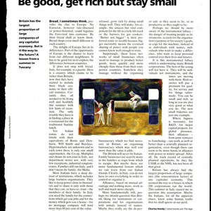 Charles Handy article comparing the success of the small business orientation in Italy to the tendencies of large corporations in Britain, and how the Italian practice keeps businesses both wealthy and human, 1991; Charles Handy Papers; Box 20, Folder 4; 1 page