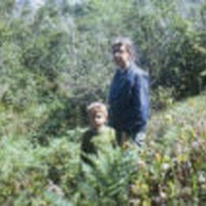 Children standing among brush and trees in the sunlight.
