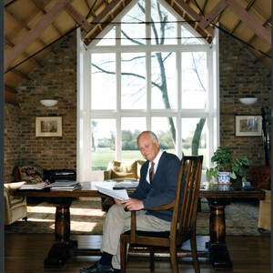 Color photo of Charles Handy, taken by Elizabeth Handy. Handy is seated at a desk near a window. He is turning away from the window to gaze directly into the camera lens.