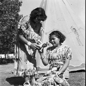 SERIES: "Golden Empire Centennial" as part of the 100 year celebration of John Sutter landing at the Sacramento River in August of 1839. This view shows a woman and child dressed in Native American clothing examining a doll.