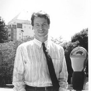 Sacramento City Council candidate poses next to parking meter.