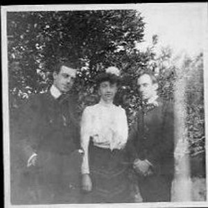 Exterior view of three adults, two men and one woman pose for their picture. From left to right; Uncle Bill Howe, Edna Bartlett Galvin, and Uncle Luke Howe.