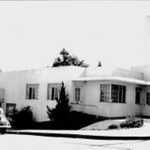 Photo, black and white: The Helwig Building on North High and Bodega Avenue in Sebastopol circa 1940. One story stucco building with an unusual tower, located at 7207 Bodega. C. A. Caulkin builder.