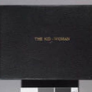 Album is bound in black textured material. The title, "The Kid-Woman," is embossed in gold on the cover. Photographs are of Charmian London, primarily after Jack London's death. Includes visitors to Beauty Ranch, travel to Europe, and portraits. Slight wear at corners and edges. Top 1/2 inch missing from top of spine. Sticker affixed to back cover reads: "OA 49865." Several photos in album have been removed for reasons unknown.