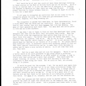 Thought for the day by Charles Handy on the moral duty of finding one's professional purpose, as well as one's God-given, personal purpose, in life. Handy begins the thought discussing the danger in attempting to categorize people too early in life and fit them into specific slots. He proceeds to talk about the influence of his time spent in Japan, where managers allow their employees to grow along horizontal fast-tracks, rather than vertical ones, in order to determine where their best and special contribution to an organization can be. Handy suggests that this model of growth should be adopted in Britain, with young people being guaranteed a horizontal track for three years or so after school or college to find their best fit. He goes on to argue that this option for the young should be a moral duty, a chance to give all the opportunity to find their niche in life and their particular talents as early as possible.