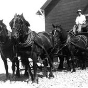 Photo--Black and white: The Garbro Orchard, two men on a four-horse drawn wagon full of apple boxes circa 1910s . The Garbro Orchard was located at Vine Hill Road and River Road area. The Garbro Orchard was operated by brothers A.M. and J.M. Garcia.