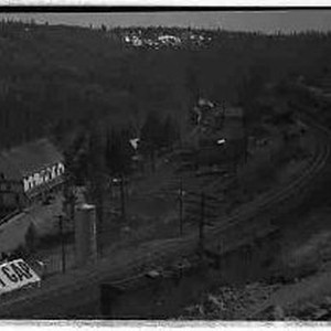 Overview of railroad tracks and buildings in a mountain setting; one building has "Emgt. Gap" painted on the roof.