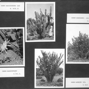 Four photographs of the desert garden mounted on a black page, labeled "Cereus grandicustatus 1936, N. R-36, 37", "Cereus grandicustatus, N. H-1, 2", "Cereus horribarbis - 1936, N. R-38", and "Cereus horridus 1934, N. H-15."
