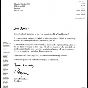 Correspondence from Barbara Matthews to Charles Handy congratulating Handy on the award of CBE. Matthews states that she was delighted to see Handy's name in the New Years Honours. She proceeds to state what a tremendous influence Handy's work has been at TMA. She closes the letter with good wishes to Charles and Elizabeth.