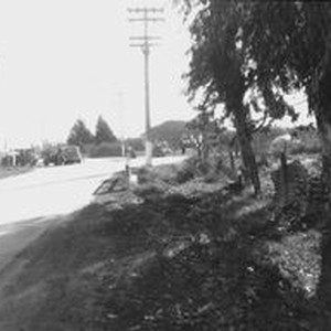 Photo--black and white: The scene of a car accident looking South on Gravenstein Highway (116) at the intersection of Bloomfield Road. Circa 1930s