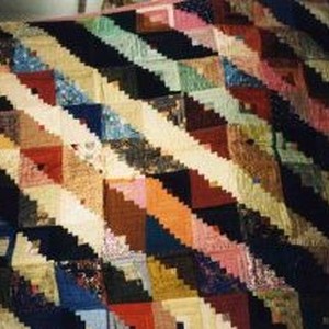 A log cabin pattern quilt of multi-colored silk pieces with pink cotton tied backing.
