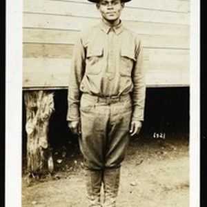 Photograph picture postcard of an unidentified male soldier, Texas, [s.d.]. "Post card, place stamp here, AZO, correspondence, address" -- printed on back. [Description English/roman)]